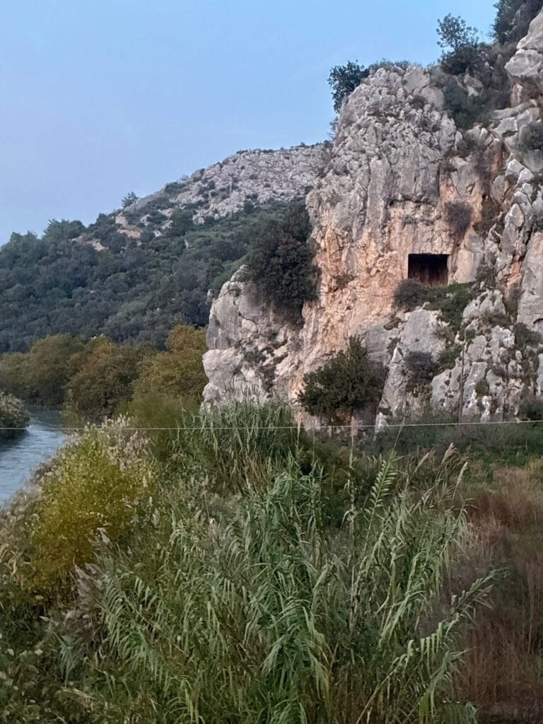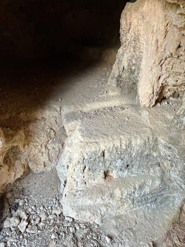 Rota işaretlerini izleyerek tepeden aşağı inmeye başladım. Patikanın hemen sağında birkaç mağara gördüm. Birinin önünde kayaya oyulmuş merdivenler vardı; belli ki bunlar da tahrip olmuş mezarlardı. Birkaç fotoğraf çekip inişe devam ettim.