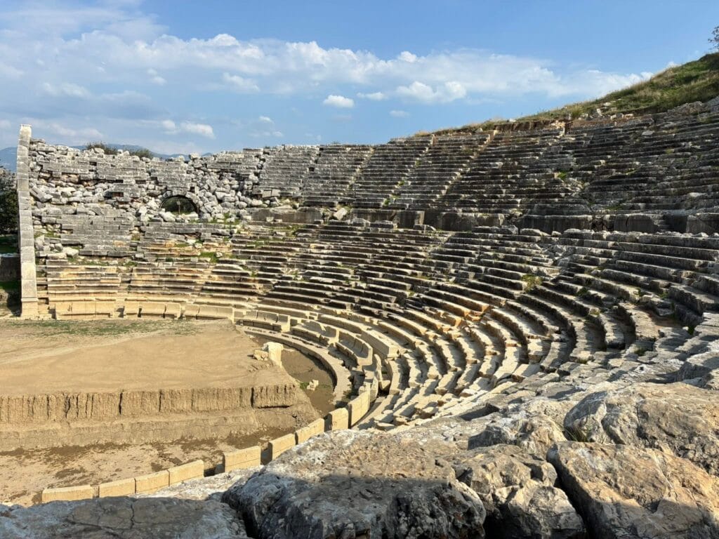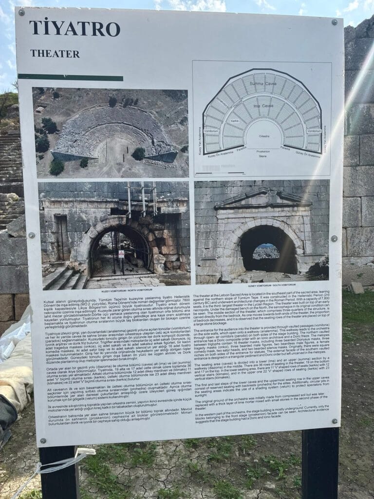 Kentte en çok ilgimi tiyatro çekmişti. Kültür Bakanlığı’nın açıklama panosuna göre yapı, eski bir nekropolisin üzerine inşa edilmişti. Ayrıca bozulan kuzey oturma sıralarının altında bir lahitin görülebildiği belirtiliyordu. Ne kadar arasam da o lahiti bulamadım.